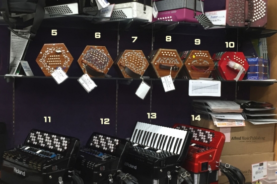Happy youthful schoolgirl with microphone performing song with two classmates playing trumpet and acoustic guitar at lesson