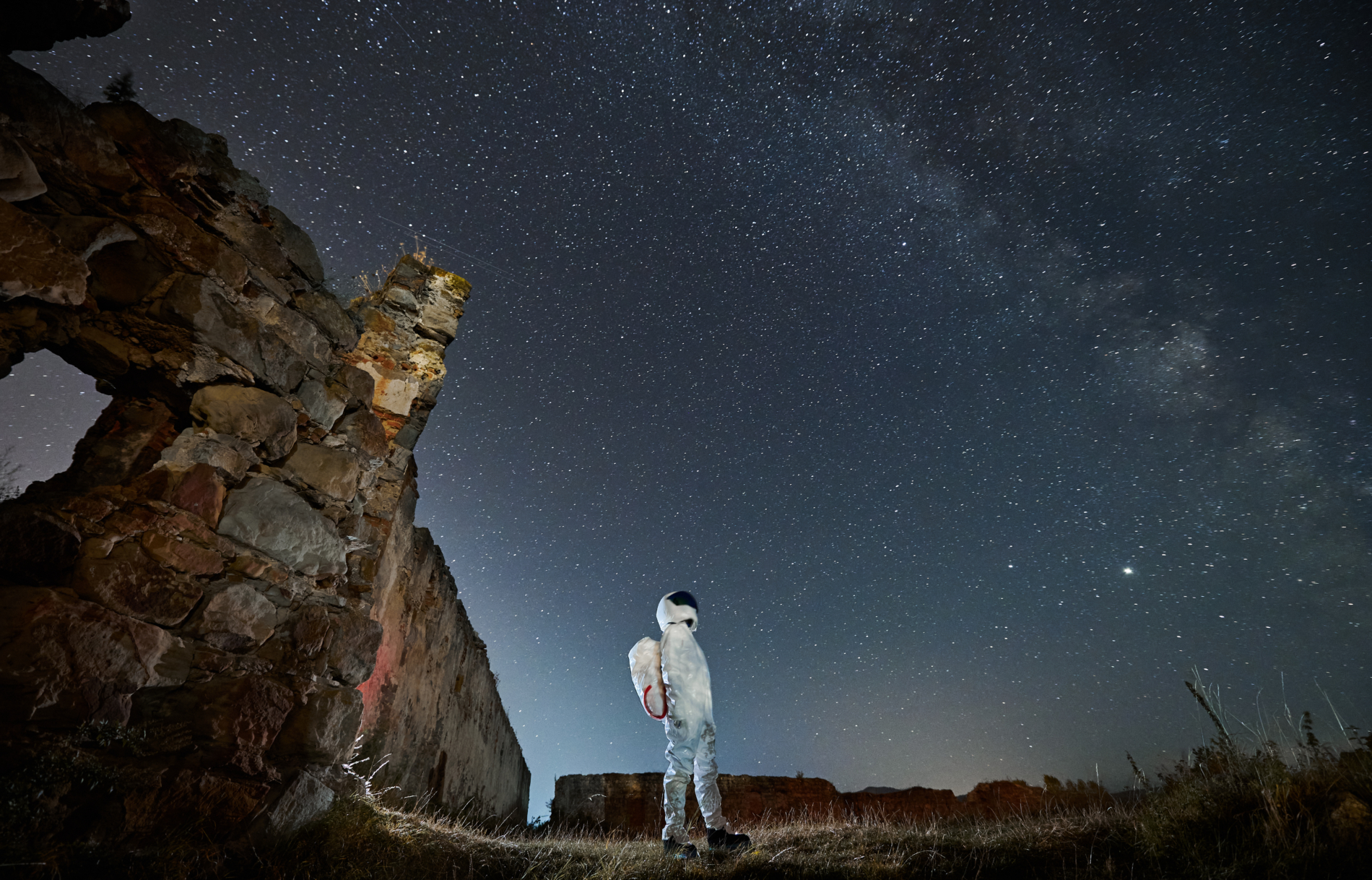Spaceman in special white suit and helmet standing and looking on starry sky with Milky way at night. Concept of astronomy and cosmic travelling.